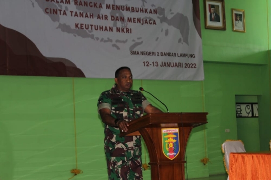Kasdim 0410/KBL Letkol Inf Dr. Drs. Imam Syafe’i S.H.,MH memberikan Materi Wawasan Kebangsaan dengan tema “Menumbuhkan Cinta Tanah Air dan Menjaga Keutuhan NKRI” bertempat di GSG SMAN 2 Bandar Lampung Gotong Royong Bandar Lampung, Rabu (12/01).
