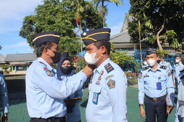Sembilan pegawai Lembaga Pemasyarakatan (Lapas) Kelas I Bandarlampung menerima SK kenaikan pangkat satu tingkat lebih tinggi yang digelar di Lapangan Upacara, Senin (21/11)