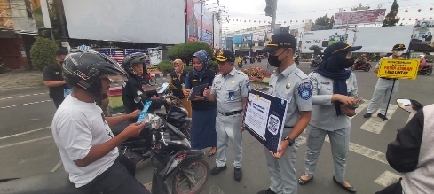 Jasa Raharja bersama Bapenda dan Polantas Polri melakukan sosialisasi UU no 22 pasal 74 tahun 2009 di titik titik keramaian yang ada di Lampung, Senin (13/2/2023).