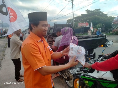 Ketua DPW PKS Lampung Ahmad Mufti Salim bersama kader PKS Lampung Tengah membagikan makanan pembuka puasa di Yukumjaya, Lampung Tengah. Dengan mengenakan atribut khas PKS berwarna oranye, tidak nampak kecangggungan Mufti Salim saat membagikan makan untuk berbuka puasa. Bahkan sesekali Mufti menyapa ramah warga yang melintas.