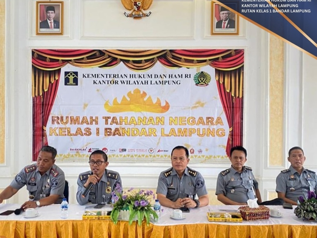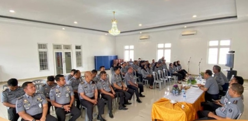 Kepala Divisi Pemasyarakatan (Kadivpas) Kantor Wilayah Kementerian Hukum dan HAM Lampung, R.B. Danang Yudiawan memberikan penguatan tugas dan fungsi kepada seluruh pegawai Rumah Tahanan Negara (Rutan) Bandarlampung saat kunjungannya ke Rutan, Senin (23/10).