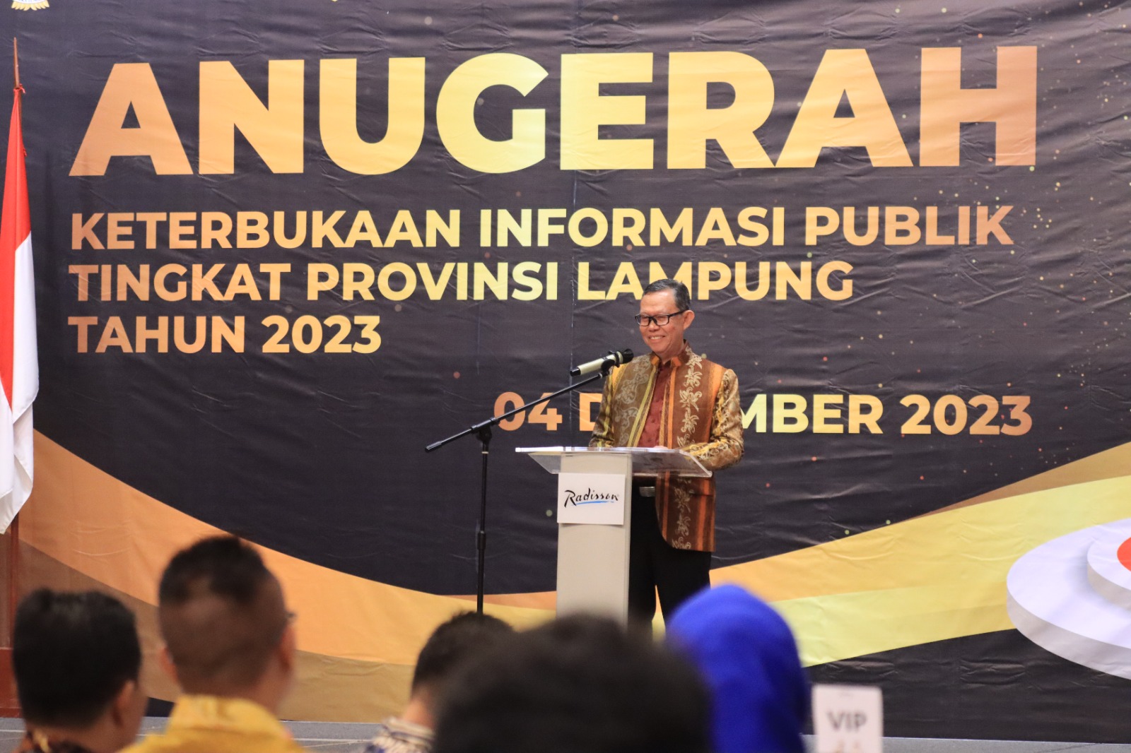 Bandar Lampung – Gubernur Lampung diwakili oleh Sekretaris Daerah Provinsi Lampung, Fahrizal Darminto menghadiri Anugerah Keterbukaan Informasi Publik Tingkat Provinsi Lampung Tahun 2023 bertempat di Ballroom Hotel Radisson, Senin (04/12/2023).
