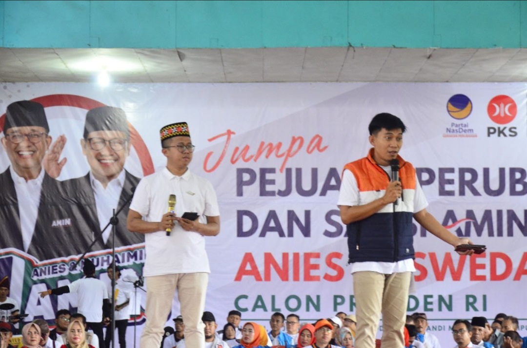 Tim Nasional Anies Baswedan dan Muhaimin Iskandar (AMIN), Muhammad Yuqi bersama Anggota TKD Pemenangan Saksi AMIN PKS Lampung Oskar Saprudin memberikan pembekalan dan pelatihan IT kepada 1000 pejuang perubahan (relawan) dan saksi AMIN se-wilayah Lampung, di Gelanggang Olah Raga (GOR) Podomoro Candi Mas, Kecamatan Natar, Kabupaten Lampung Selatan, Minggu (14/1/2024).