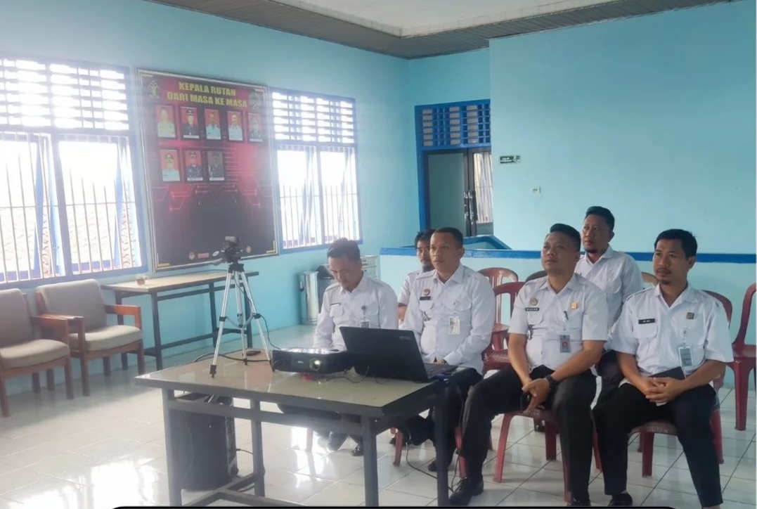 Kepala Rutan Kelas IIB Kotabumi, Nur Febrianto, A.Md.I.P., S.H., M.M, Kasubsi Pelayanan Tahanan, M. Rizcho Sakanandy, S.H., petugas kesehatan dan staf pelayanan tahanan Rutan Kelas IIB Kotabumi ikuti kegiatan secara virtual melalui zoom meeting Sosialisasi Permenkumham 25 Tahun 2023 Tentang Pelayanan Publik Berbasis HAM (P2HAM).