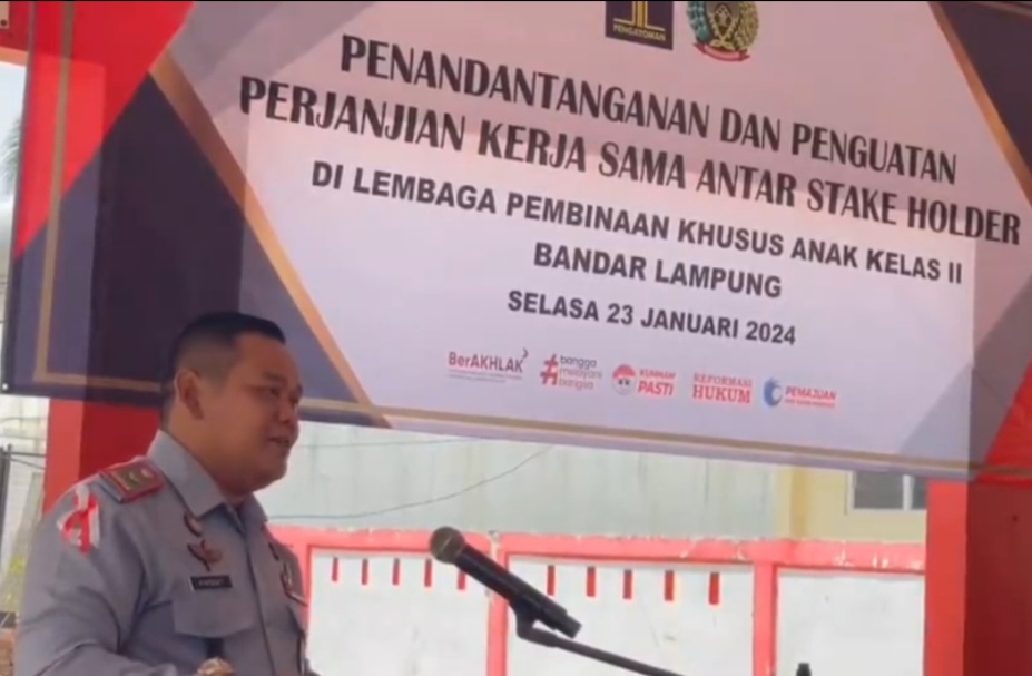 Kepala Lembaga Pembinaan Khusus Anak (LPKA) Kelas Il Bandar Lampung, Anggit Yongki Setiwan, resmi menggelar penandatanganan perjanjian kerjasama dengan para stakeholder terkait bertempat di Aula LPKA Bandar Lampung pada, Selasa (23/01/2024).