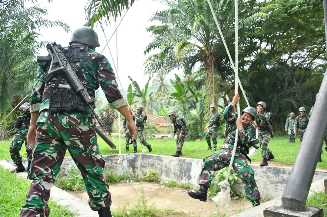 Prajurit Batalyon Yonif 7 Marinir melaksanakan latihan ketangkasan Halang Rintang dalam rangka Latihan Dasar Perorangan TW I di Brigif 4 Marinir/BS, Piabung, Padang Cermin, Pesawaran. Senin, (5/02/2024).