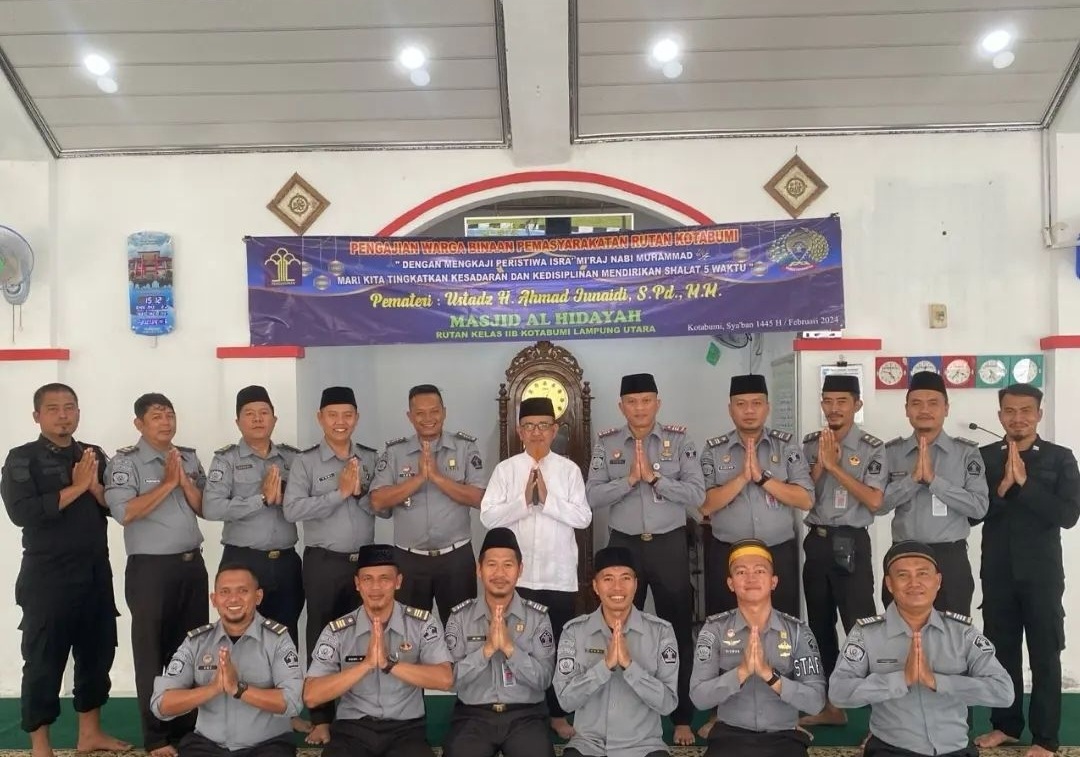 Rumah Tahanan Negara (Rutan) Kelas IIB Kotabumi, melaksanakan pengajian bagi Warga Binaan Pemasyarakatan (WBP) dengan Tema “Dengan Mengkaji Peristiwa Isra Mi’raj Nabi Muhammad SAW, Mari Kita Tingkatkan Kesadaran dan Kedisiplinan Mendirikan Shalat 5 Waktu”. Kegiatan ini bertempat di Masjid Al-Hidayah Rutan Kelas IIB Kotabumi, Senin (12/02/2024).