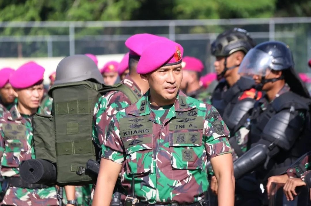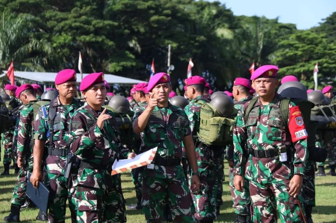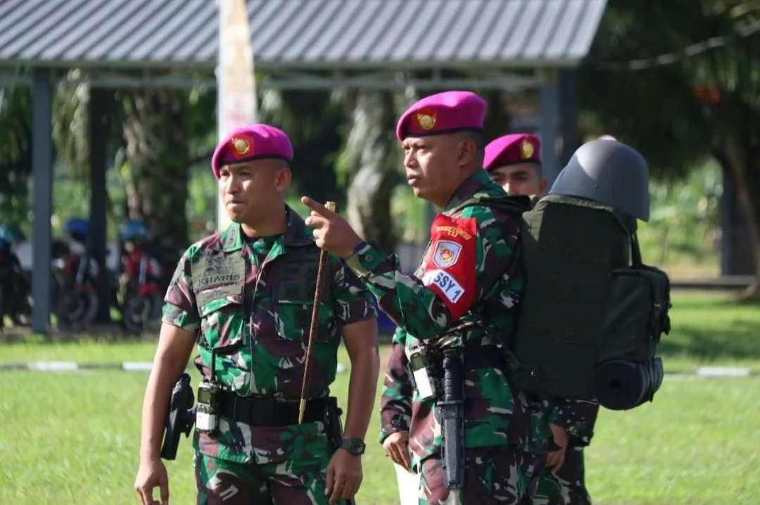 Perwira Staf Operasi (Pasops) Brigif 4 Mar/BS Lerkol Mar Ahkmad Kharis Mukyidin memimpin Apel Gelar Pasukan Pengamanan Pemilu secara serentak di jajaran Brigif 4 Mar/BS yang berlangsung di Lapangan apel Yonif 9 Marinir, Desa Batumenyan, Kec. Teluk Pandan, Kab. Pesawaran-Lampung. Selasa, (13/02/2024).