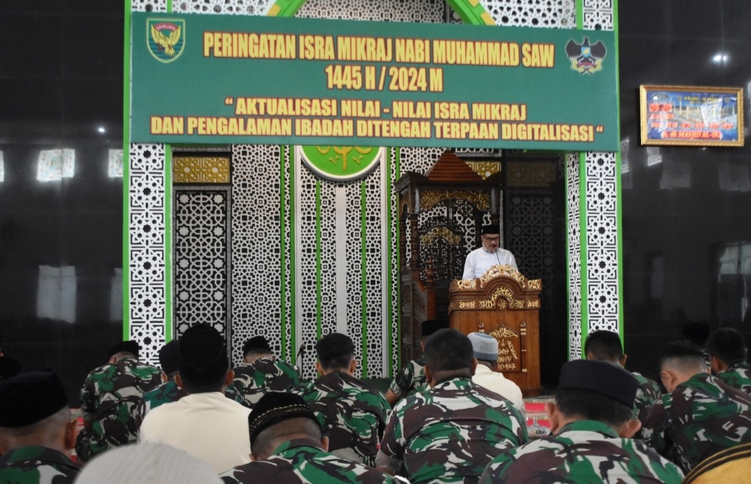 “ Isra’ Mi’raj, merupakan perjalanan malam nabi besar Muhammad SAW, atas kehendak Allah SWT sebagai hamba-nya, untuk memperlihatkan sebagian tanda-tanda kebesaran dan kekuasaan-Nya, pada peristiwa Isra’ Mi’raj ini, Allah SWT memerintahkan kepada umat islam untuk menegakkan sholat lima waktu, sebagai tuntunan keimanan dalam kehidupan. Sholat mengajarkan kepada kita untuk berdisiplin dalam segala hal, baik dalam kehidupan pribadi, di satuan maupun di lingkungan masyarakat, “tutur Danrem.
