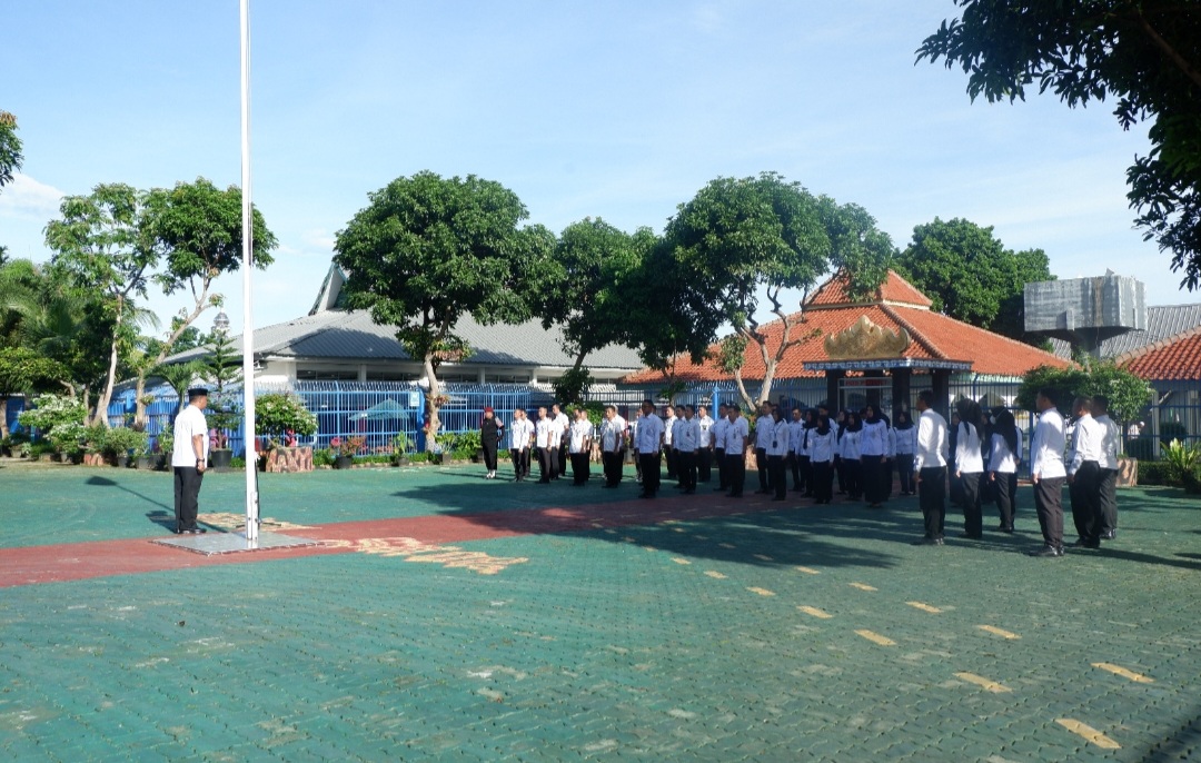 Kepala Lapas Kelas I Bandar Lampung, Saiful Sahri pimpin apel pagi sekaligus penyerahan piagam Penghargaan pegawai teladan edisi Januari–Februari kepada Beli Rizki Ananda, Rabu (06/03).