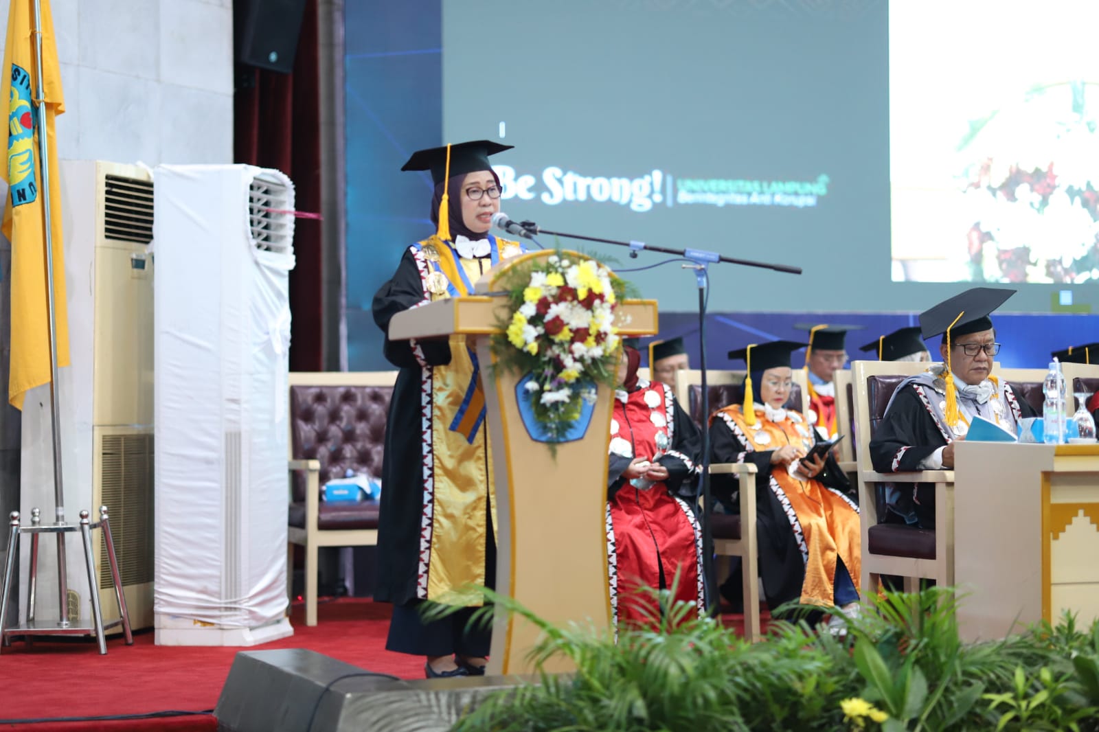 Rektor Unila Prof. Dr. Ir. Lusmeilia Afriani, D.E.A., IPM., ASEAN Eng., memberikan selamat dan rasa bangga kepada seluruh wisudawan dalam pidatonya.