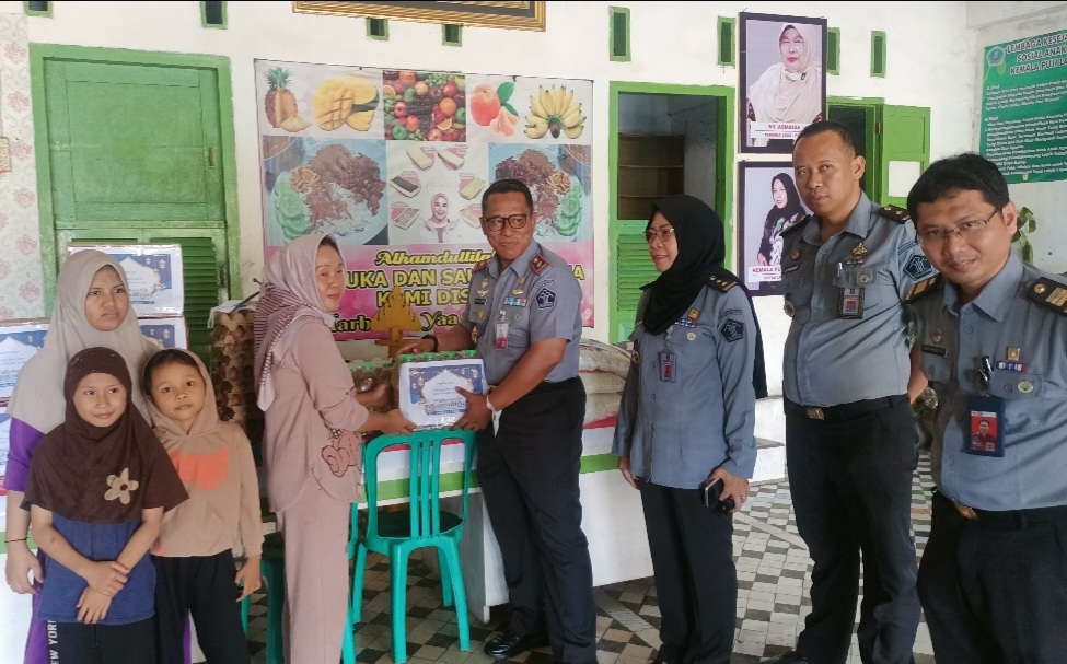 Kalapas Kelas I Bandarlampung, Saiful Sahri didampingi Pejabat Struktural berikan Santunan kepada pengurus Lembaga Kesejahteraan Sosial Anak (LKSA) Kemala Puji Lampung sebagai bentuk Tali Kasih di bulan Ramadhan, Senin (01/04).