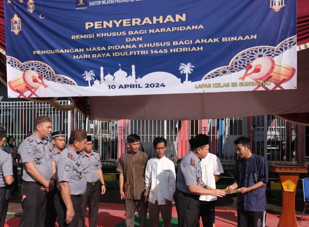 Kakanwil Kemenkumham Babel, Harun Sulianto menyerahkan secara langsung SK Remisi khusus Idul Fitri 1445 H/ 2024 di Lapas Kelas IIB Sungailiat, Rabu (10/04/2024). Penyerahan SK remisi diserahkan secara simbolis kepada 4 orang Warga Binaan.