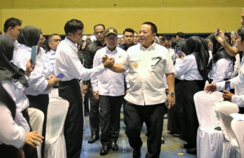 Gubernur Lampung Arinal Djunaidi menyerahkan SK Pegawai Pemerintah dengan Perjanjian Kerja (PPPK) Jabatan Fungsional Kesehatan dan Fungsional Guru, serta melakukan pelantikan dan pengangkatan sumpah/janji ASN ke dalam jabatan fungsional dilingkungan Pemerintah Provinsi Lampung, berlangsung di GSG PKOR Way Halim Bandar Lampung, Rabu (8/5/2024).
