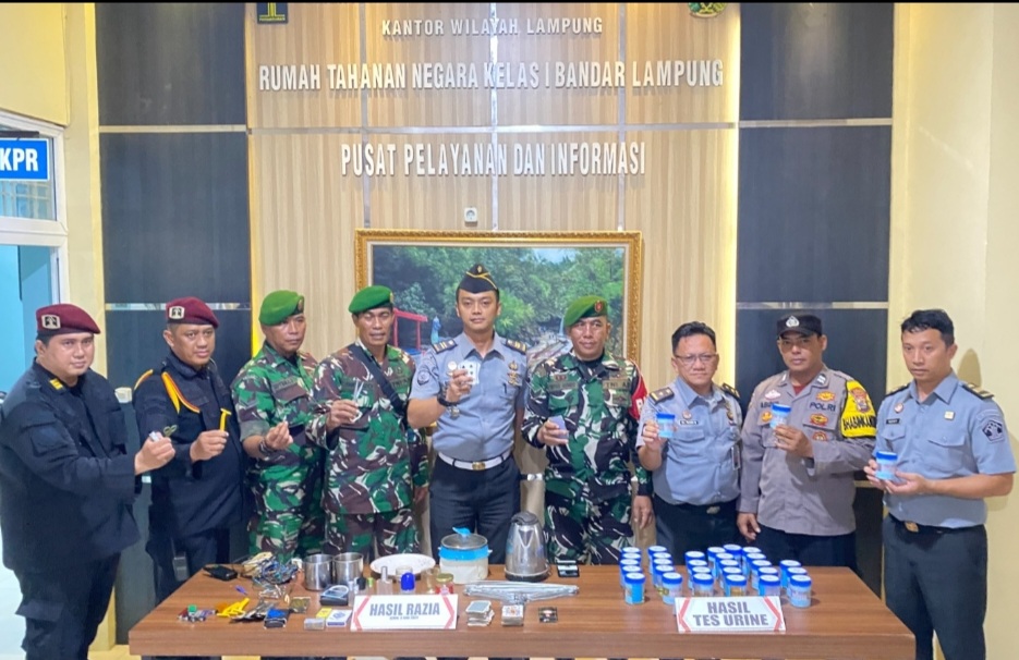 Rumah Tahanan Negara (Rutan) Kelas I Bandar Lampung bersinergi dengan TNI dan POLRI melaksanakan kegiatan Razia kamar hunian WBP dan melaksanakan test Urine kepada WBP Rutan secara acak.
