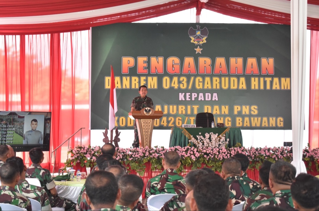 Mengawali pengarahannya Danrem mengucapkan terima kasih kepada seluruh prajurit dan PNS serta anggota Persit atas penyambutannya, tak lupa Danrem juga mengajak anggota Kodim 0426/TB untuk selalu bersyukur dan berdoa kepada Allah SWT, yang telah begitu banyak melimpahkan nikmat kepada kita semua.