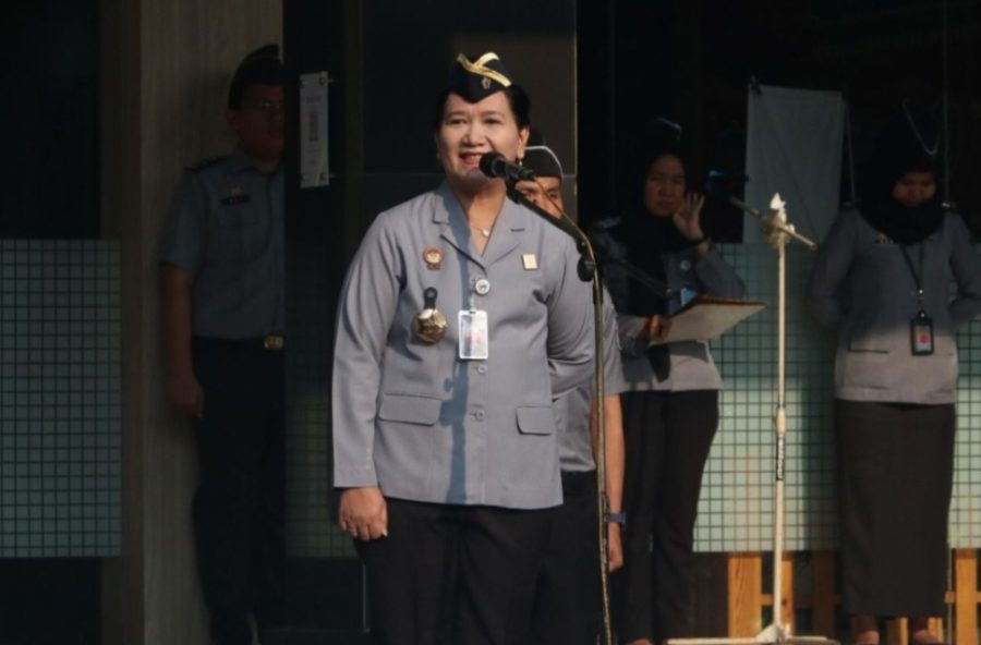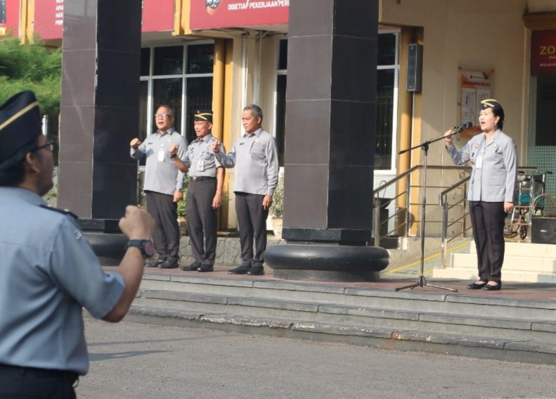 Kepala Kantor Wilayah Kementerian Hukum dan Hak Asasi Manusia (Kemenkumham) Lampung, Sorta Delima Lumban Tobing pimpin apel pagi dengan penuh semangat dan menyampaikan sejumlah informasi penting kepada seluruh peserta apel, Senin (29/07)