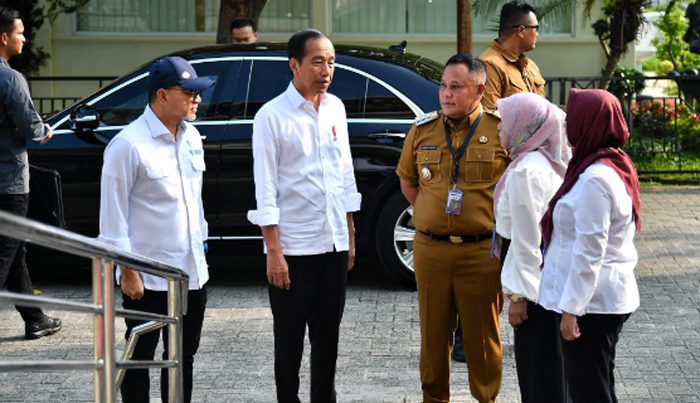Pj. Gubernur Lampung Samsudin mendampingi Presiden RI Joko Widodo (Jokowi) melakukan kunjungan ke Rumah Sakit Umum Daerah (RSUD) dr. H. Bob Bazar SKM Kabupaten Lampung Selatan, Kamis (11/7/2024).