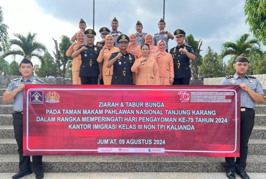 Kantor Imigrasi Kelas III Non TPI Kalianda bersama Dharma Wanita Persatuan (DWP) Mengikuti kegiatan Ziarah dan Upacara Tabur bunga yang dilaksanakan oleh Kantor Wilayah Kemenkumham lampung Menyambut Hari Pengayoman ke-79 tahun 2024 yang digelar di Taman Makam Pahlawan (TMP) Tanjungkarang, Senin (09/08/2024)