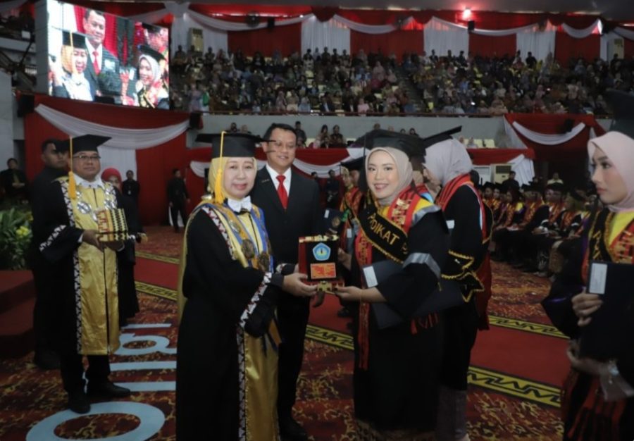 Rektor Unila Prof. Dr. Ir. Lusmeilia Afriani, D.E.A., IPM., ASEAN Eng., memberikan selamat dan rasa bangga kepada seluruh wisudawan dalam pidatonya.