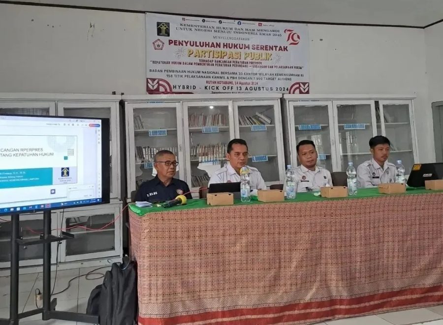 Kegiatan Penyuluhan hukum dilaksanakan oleh Lembaga Bantuan Hukum (LBH) Menang Jagad dan Kanwil Kemenkumham Lampung dalam hal ini dihadiri oleh Kepala Bidang Hukum Kantor Wilayah Kemenkumham Lampung, Safatil Firdaus, S.H., M.Si dengan materi Partisipasi Publik Terhadap Rancangan Peraturan Presiden Tentang Kepatuhan Hukum dalam Pembentukan Peraturan Perundang-Undangan dan Pelaksanaan Hukum.