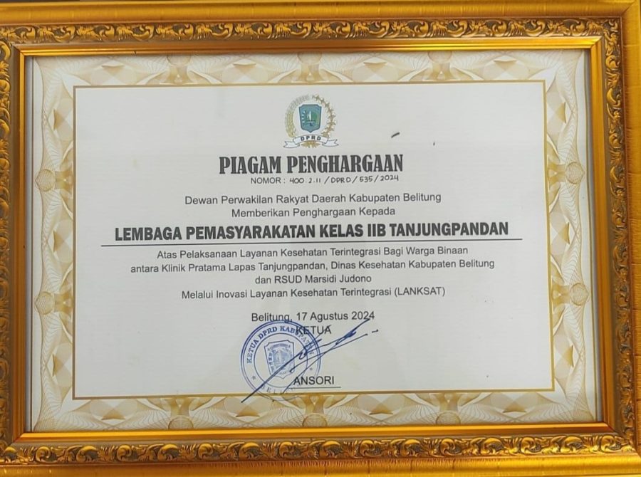 Inovasi Unggulan di Lembaga Pemasyarakatan (LAPAS) Kelas IIB Tanjungpandan kembali meraih penghargaan. Kali ini, Dewan Perwakilan Rakyat Daerah (DPRD) Kabupaten Belitung memberikan penghargaan kepada Lapas Tanjungpandan atas pelaksanaan Layanan Kesehatan Terintegrasi (LANKSAT) bagi warga binaan. Inovasi tersebut merupakan sinergitas antara Lapas Kelas IIB Tanjungpandan melalui Klinik Pratama LADA bersama Dinas Kesehatan Kabupaten Belitung dan RSUD Marsidi Judono.