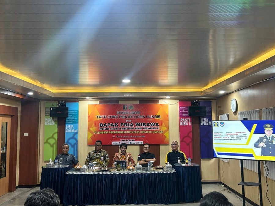 Kunjungi Lampung, Inspektur Wilayah (Irwil) VI Inspektorat Jenderal Kemenkumham RI, Pria Wibawa berikan Sosialisasi Tata Cara Penjatuhan Hukuman Disiplin kepada jajaran Lapas Kelas I Bandar Lampung di Aula Radin Intan, Sabtu (14/09).