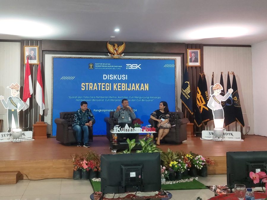 Diskusi dalam kegiatan ini dipandu oleh Solina Lumban Toruan selaku Moderator Diskusi Strategi Kebijakan. Acara dilanjutkan dengan pemaparan Hasil Evaluasi Peraturan Menteri Hukum dan HAM Nomor 16 Tahun 2023 tentang Perubahan Ketiga Atas Peraturan Menteri Hukum dan HAM Nomor 3 Tahun 2018 tentang Syarat dan Tata Cara Pemberian Remisi, Asimilasi, Cuti Mengunjungi Keluarga, Pembebasan Bersyarat, Cuti Menjelang Bebas, dan Cuti Bersyarat pada Tahun 2024 oleh Bapak Kunrat Kasmiri selaku Kepala Divisi Pemasyarakatan Kantor Wilayah Kemenkumham Kepulauan Bangka Belitung.
