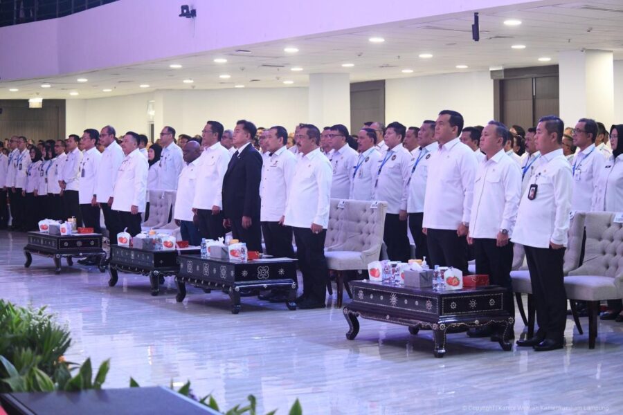 Kepala Kantor Wilayah Kemenkumham Lampung, Dodot Adikoeswanto, bersama Kepala Divisi Administrasi, M. Ikmal Idrus, Kepala Divisi Pemasyarakatan, Kusnali, dan Kepala Divisi Pelayanan Hukum dan HAM, Agvirta Armilia Sativa. Didampingi Kepala Bagian Umum, Denial Arief dan Kepala Bagian Program dan Humas, Sari Mesfriati beserta jajaran Kantor Wilayah, menghadiri Refleksi Akhir Tahun 2024 yang diselenggarakan di Kampus Politeknik Pengayoman Indonesia (Poltekpin), Kota Tangerang, Senin (16/12/2024).
