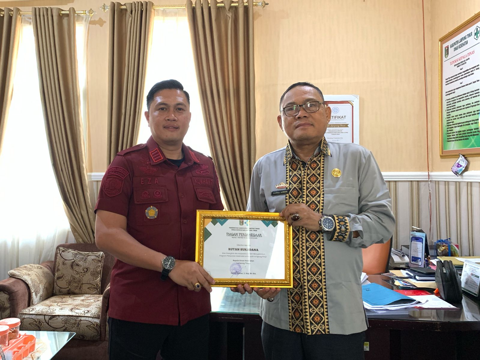 Bertempat di Ruang Kepala Dinas, Penghargaan diserahkan langsung oleh Kepala Dinas Kesehatan Lampung Timur, Hairul Azman dan diterima dengan penuh rasa bangga oleh Kepala Rutan Kelas IIB Sukadana, Farizal Antony.