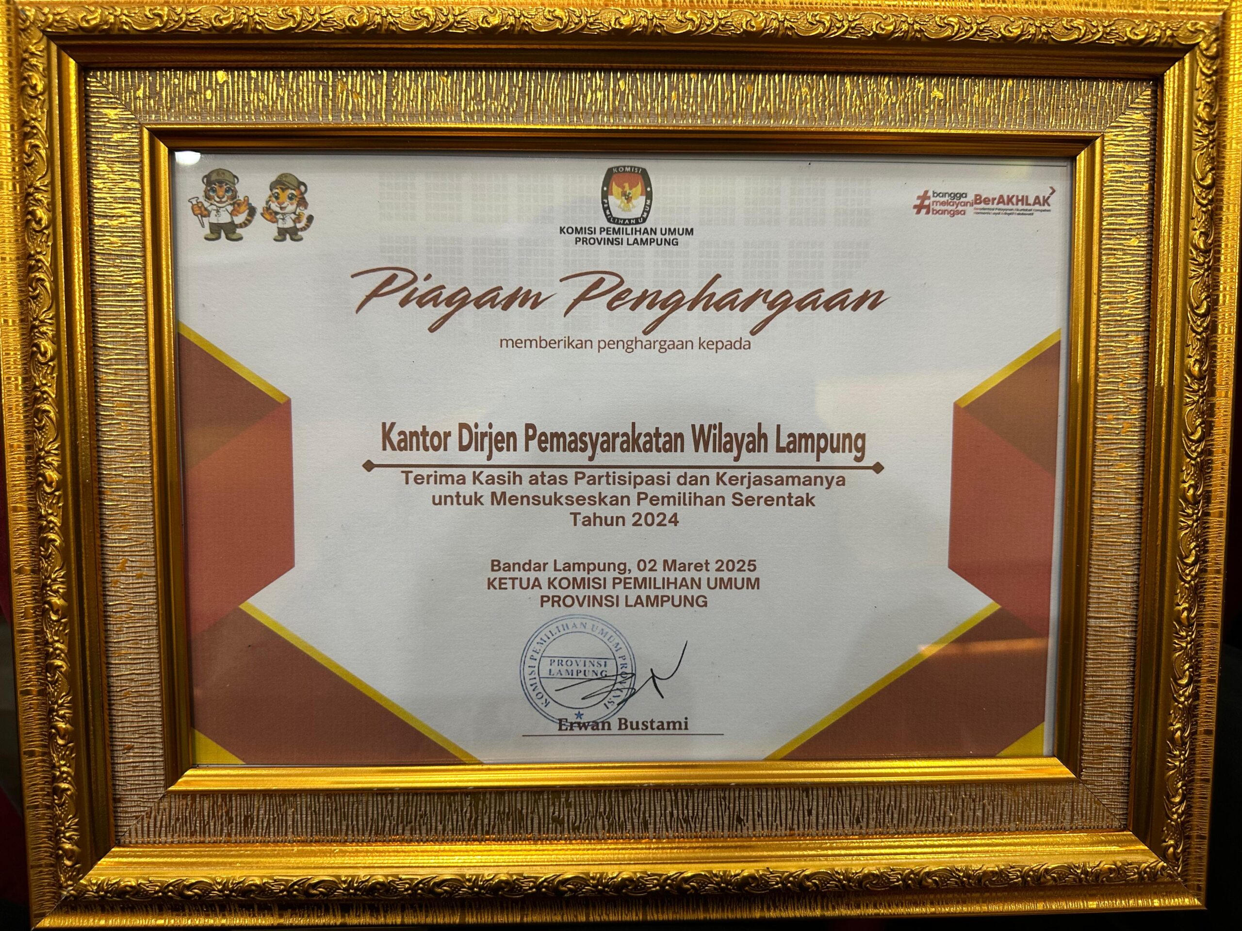 Penghargaan ini diberikan sebagai bentuk pengakuan atas komitmen Ditjenpas Lampung dalam memastikan warga binaan Lembaga Pemasyarakatan (Lapas) dan Rumah Tahanan Negara (Rutan) tetap dapat menyalurkan hak pilihnya dengan baik dan tertib.