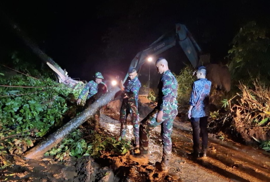Pleton Siaga Prajurit Yonif 7 Mar/Ajabra Brigif 4 Mar/BS bergerak cepat dalam penanganan material longsor yang menyebabkan kerusakan dan kemacetan lalu lintas bekerja sama dengan masyarakat dan stakeholder setempat.