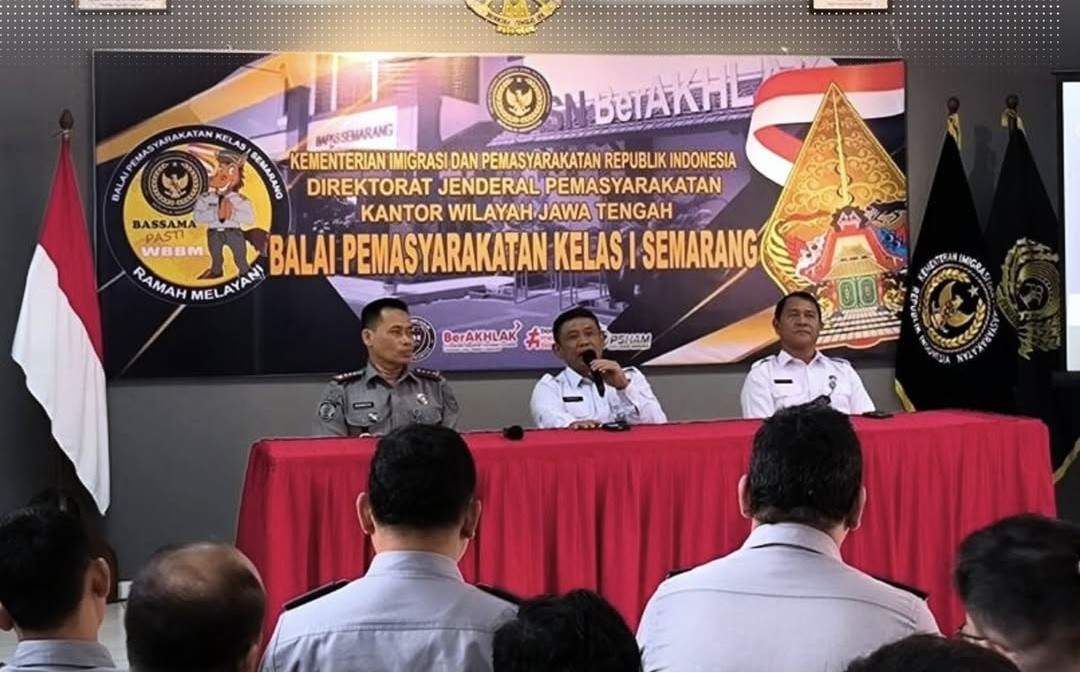 Kepala Kantor Wilayah Direktorat Jenderal Pemasyarakatan (Ditjenpas) Jawa Tengah, Kunrat Kasmiri, memberikan penguatan Zona Integritas (ZI) kepada seluruh pegawai di Balai Pemasyarakatan (Bapas) Kelas | Semarang. Kegiatan ini bertujuan untuk memperkuat komitmen dan konsistensi dalam mewujudkan Wilayah Bebas dari Korupsi (WBK) dan Wilayah Birokrasi Bersih dan Melayani (WBBM), Senin (24/03).