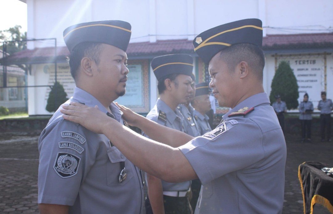 Kepala Lembaga Pemasyarakatan (Lapas) Kelas IIB Kotaagung Andi Gunawan sematkan kenaikan tanda pangkat setingkat lebih tinggi kepada 4 (empat) pegawai sekaligus pemberian penghargaan penggagalan penyelundupan Handphone (HP) kepada satu pegawai di Aula Lapas Kotaagung, Selasa (15/4/2025)