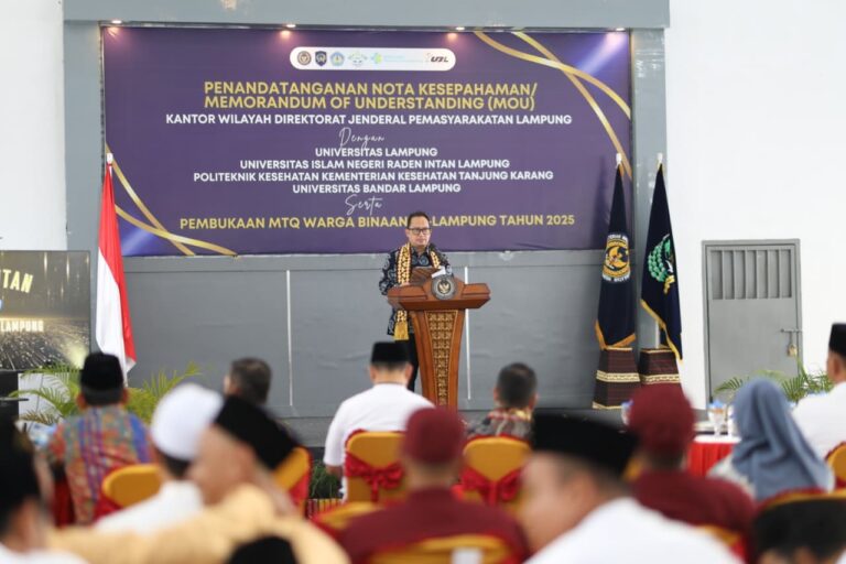 Bandar Lampung – Universitas Lampung (Unila) turut berperan aktif dalam penandatanganan Nota Kesepahaman (MoU) kerja sama dengan Kantor Wilayah Direktorat Jenderal Pemasyarakatan Lampung, yang dirangkai dengan pembukaan Musabaqah Tilawatil Quran (MTQ) Warga Binaan Pemasyarakatan se-Lampung Tahun 2025.