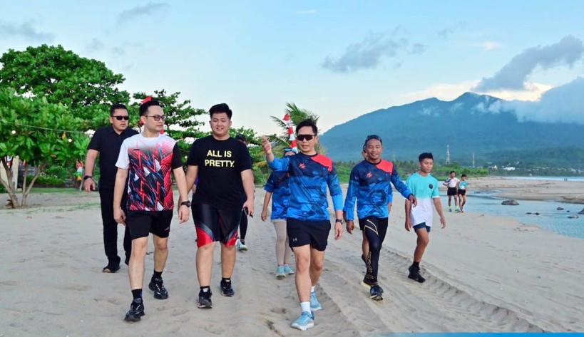 Dengan pakaian olahraga sederhana, Bupati Egi berlari kecil menyusuri jalur sembari sesekali berhenti memantau kondisi jalan, kebersihan lingkungan, hingga pemasangan atribut acara yang sudah mulai menghiasi kawasan pantai.