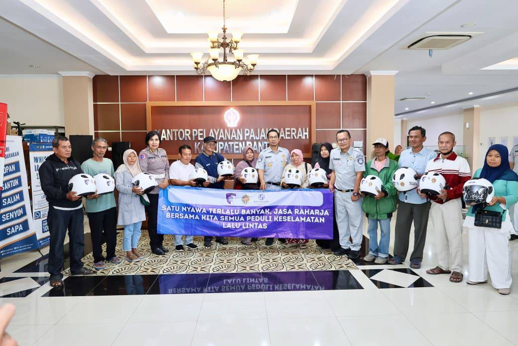Selain itu, Jasa Raharja juga ikut serta melaksanakan doa bersama dan pembagian helm kepada masyarakat di lokasi layanan Samsat Induk. Sebanyak 25 helm di setiap titik dibagikan langsung kepada wajib pajak yang datang, disertai pesan singkat keselamatan, seperti “Hati-hati di jalan, selamat sampai tujuan! dan Selamat sampai di rumah, ya”. Kehangatan interaksi ini menjadi momen yang menekankan bahwa keselamatan adalah tanggung jawab bersama, dalam hal ini adalah insan Jasa Raharja, masyarakat pengguna layanan di Samsat Induk, serta stakeholder terkait.