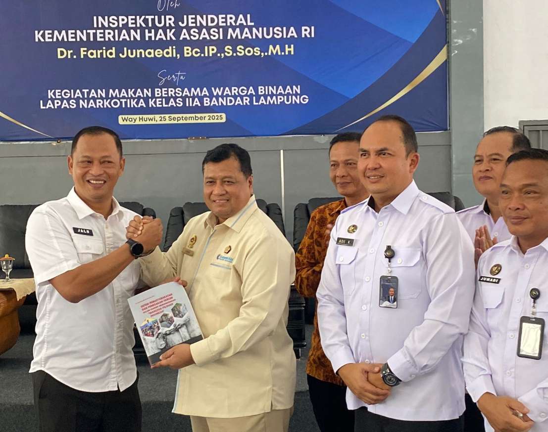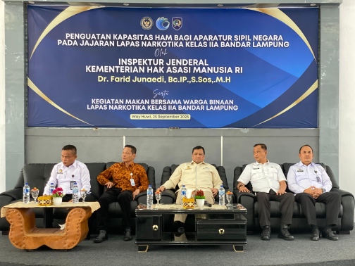 Dalam upaya memperkuat pemahaman dan implementasi Hak Asasi Manusia (HAM) di lingkungan pemasyarakatan, Inspektur Jenderal Kementerian Hak Asasi Manusia RI, Dr. Farid Junaedi, Bc.IP., S.Sos., M.H., memberikan penguatan kapasitas HAM bagi petugas dan warga binaan di Lapas Narkotika Bandar Lampung. Kamis (25/09)