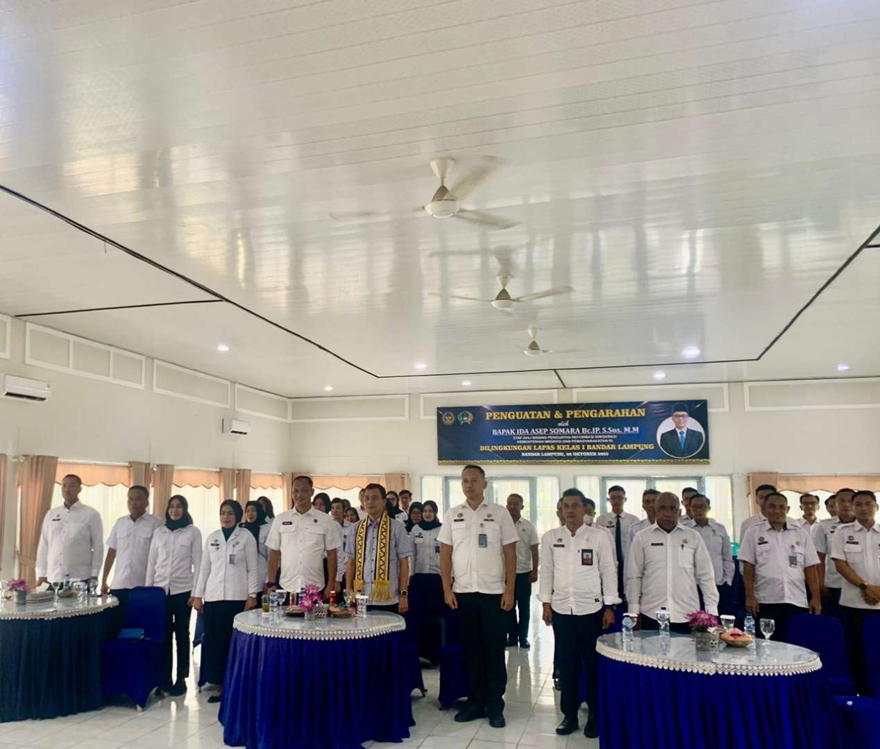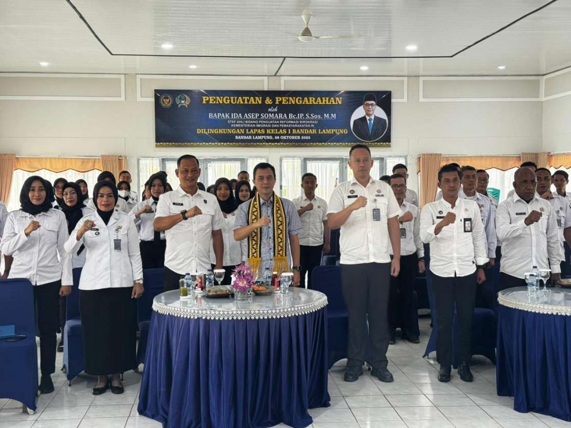 Kepala Rumah Tahanan Negara (Karutan) Kelas I Bandar Lampung, Tri Wahyu Santosa, menghadiri kegiatan Penguatan dan Pengarahan yang disampaikan oleh Staf Ahli Bidang Penguatan Reformasi Birokrasi Kementerian Imigrasi dan Pemasyarakatan Republik Indonesia, Ida Asep Somara. Kegiatan ini berlangsung di Aula Lembaga Pemasyarakatan (Lapas) Kelas I Bandar Lampung, Rabu (08/10/2025).