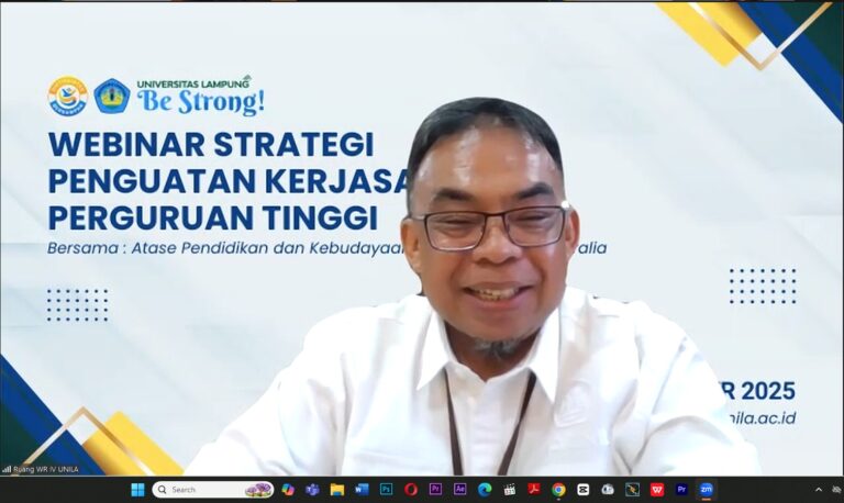 Bandar Lampung – Universitas Lampung (Unila) menggelar webinar bertajuk “Peluang Kolaborasi Indonesia dan Australia” sebagai langkah strategis dalam memperkuat kerja sama perguruan tinggi. Kegiatan yang diinisiasi Bidang Kerja Sama Unila ini berlangsung pada Rabu, 15 Oktober 2025, secara daring melalui platform zoom meeting.