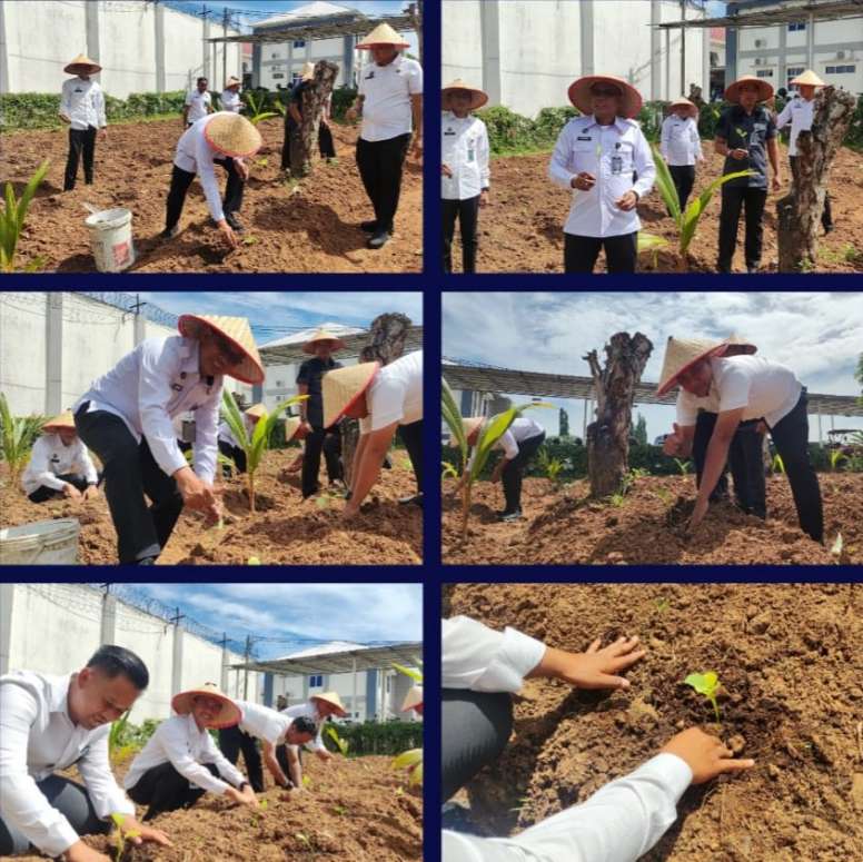 Kepala Lembaga Pemasyarakatan (Kalapas) Kelas IIB Gunung Sugih, Sastra Irawan beserta jajaran pejabat struktural melaksanakan kegiatan Penanaman Terong dan sayur kangkung di area lahan pertanian dalam rangka mendukung program pembinaan kemandirian bagi warga binaan, Kamis (30/10/2025).
