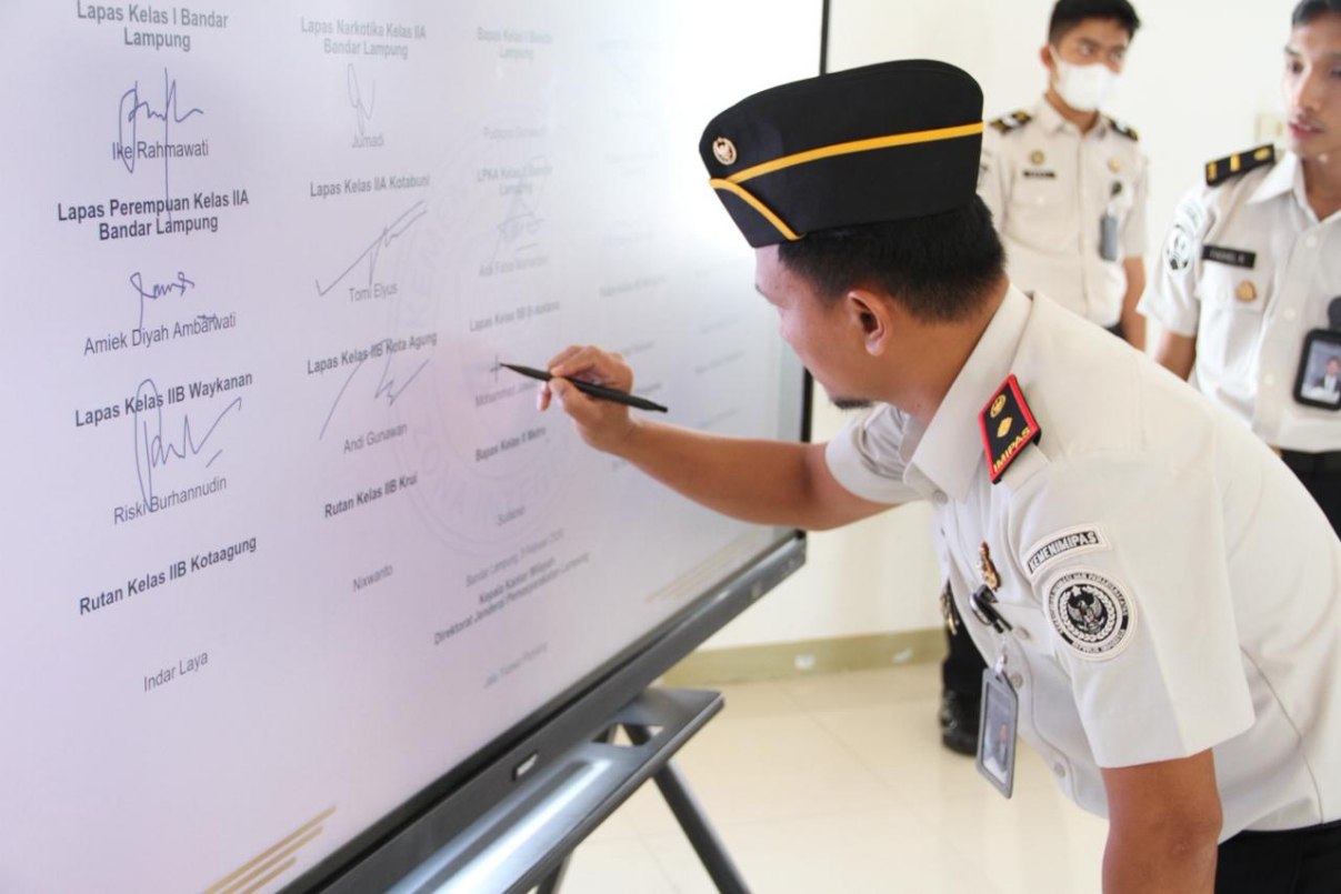 Sukadana —Kepala Rumah Tahanan Negara (Rutan) Kelas IIB Sukadana, Mohammad Jawad Cirry, mengikuti kegiatan penandatanganan komitmen bersama dan pakta integritas bersama jajaran Kantor Wilayah Direktorat Jenderal Pemasyarakatan (Kanwil Ditjenpas) Lampung, Kamis (05/02).