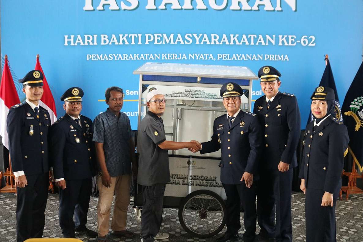 Selain itu, sebagai bentuk kepedulian sosial dan dukungan terhadap pemberdayaan ekonomi keluarga warga binaan, Lapas Cibinong menyerahkan bantuan usaha berupa gerobak kepada keluarga warga binaan. Bantuan tersebut diharapkan dapat menjadi sarana produktif dalam meningkatkan kesejahteraan keluarga serta mendukung keberlangsungan ekonomi selama proses pembinaan berlangsung.